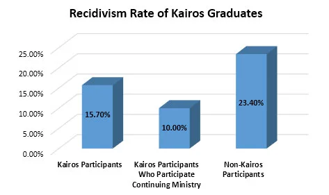 In a study of 505 inmates released from Florida prisons, the recidivism rate was only 15.7% among those who had participated in one Kairos session, and just 10% among those who had participated in two or more Kairos sessions. The non-Kairos control group in the study had a recidivism rate of 23.4%.